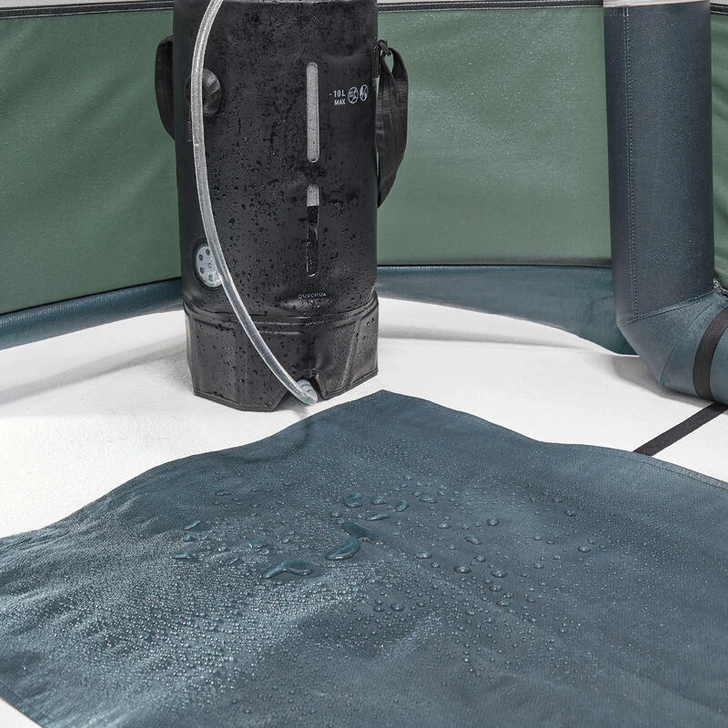Nous avons testé notre tente de douche pour valider son imperméabilité. Le premier test se fait en laboratoire pendant 3 heures sous 200 litres d’eau par heure et par m², l’équivalent d’une pluie tropicale de 200 mm par heure. Le second test se fait sur le terrain en conditions réelles par nos équipes. Cette tente de douche est conçue avec un toit en polyester enduit polyuréthane de 2000 mm ainsi que des coutures étanchées via des bandes thermocollées et 2 tapis de sol polyéthylène 195 g/m².
